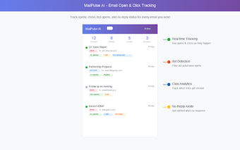 MailPulse är en gratis e-postspårningsutvidgning för Chrome som erbjuder omfattande funktioner för att övervaka e-postöppningar, klick och svar. Med realtidsnotiser kan användare se exakt när deras e-postmeddelanden öppnas, hur många gånger och vilka länkar som klickas. Programmet fungerar smidigt med både Gmail och Outlook, inklusive Office 365, vilket gör det till ett mångsidigt verktyg för alla som vill optimera sin e-postkommunikation. MailPulse har också avancerade funktioner som botdetektion och filtrering av falska öppningar för att säkerställa att statistiken är korrekt.